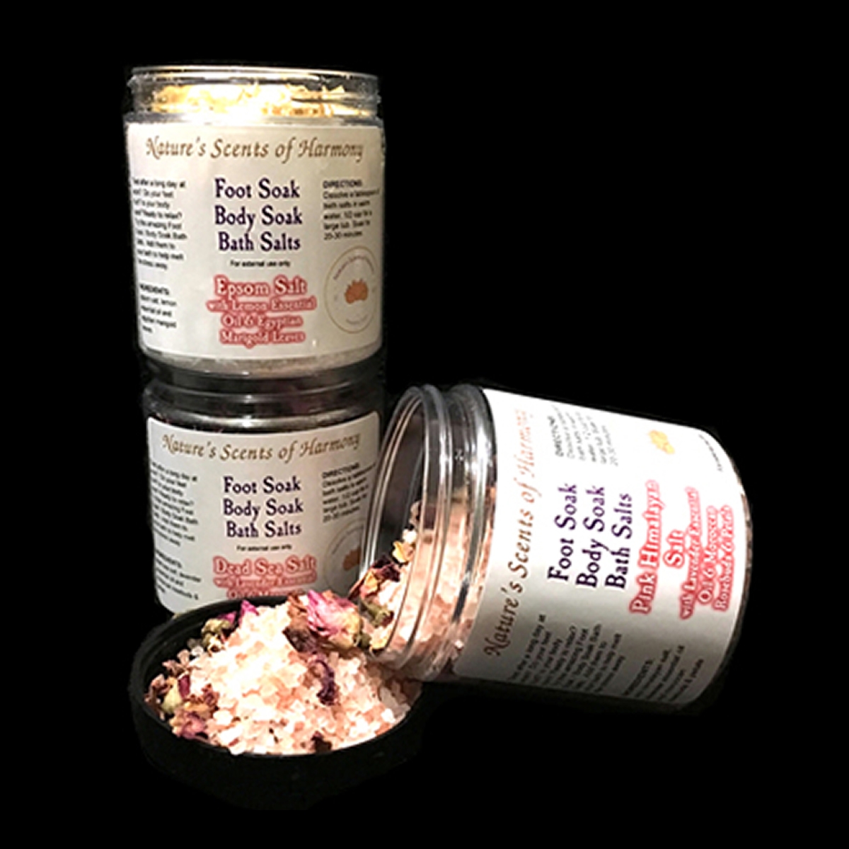 Try our amazing Foot Soak / Body Soak Bath Salts. Add them to your bath to help melt the stress away. Our bath salts come in three varieties: