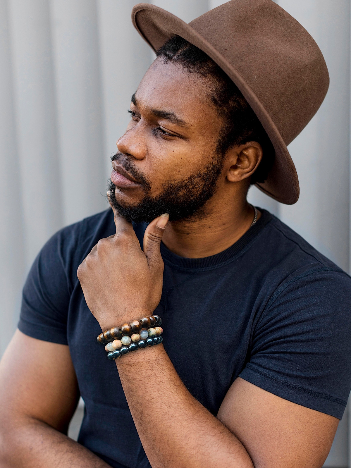 (Man wearing our Wood, Agate and Hematite bracelets)