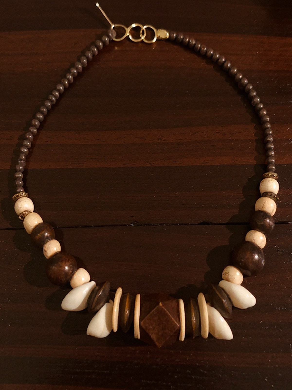 Our Shaka Collar is composed of polished wood and cowrie shells.
